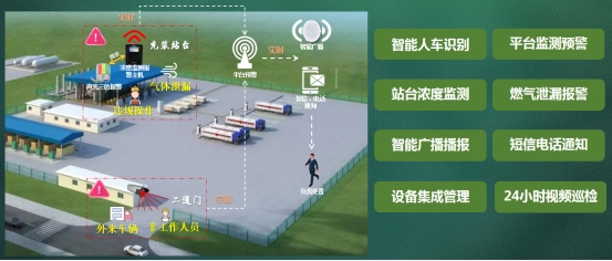 對場站的出入通行進(jìn)行嚴(yán)格的管控,借助人臉識別、車輛識別、視頻監(jiān)控等裝置對場站內(nèi)外人員車輛狀態(tài)信息進(jìn)行動態(tài)管理;在二道門外借助LED顯示及廣播系統(tǒng),展示安全監(jiān)管信息、發(fā)布異常監(jiān)管數(shù)據(jù)、提示違規(guī)操作、播放違規(guī)企業(yè)信息及安全告知信息等;結(jié)合地理信息系統(tǒng),展示生產(chǎn)環(huán)境、使用環(huán)境中燃?xì)庑孤秷?bào)警及故障信息,報(bào)警信息包括安裝地點(diǎn)、詳細(xì)位置、設(shè)備狀態(tài)、報(bào)警時(shí)間等。結(jié)合報(bào)警處置情況,可綜合展示今日報(bào)警及已處理情況、今日故障及已處理情況等。通過精細(xì)化的部署及監(jiān)管,使管理部門對場站運(yùn)行的實(shí)際情況得到充分了解,從而規(guī)避和降低可能發(fā)生的各類風(fēng)險(xiǎn)。